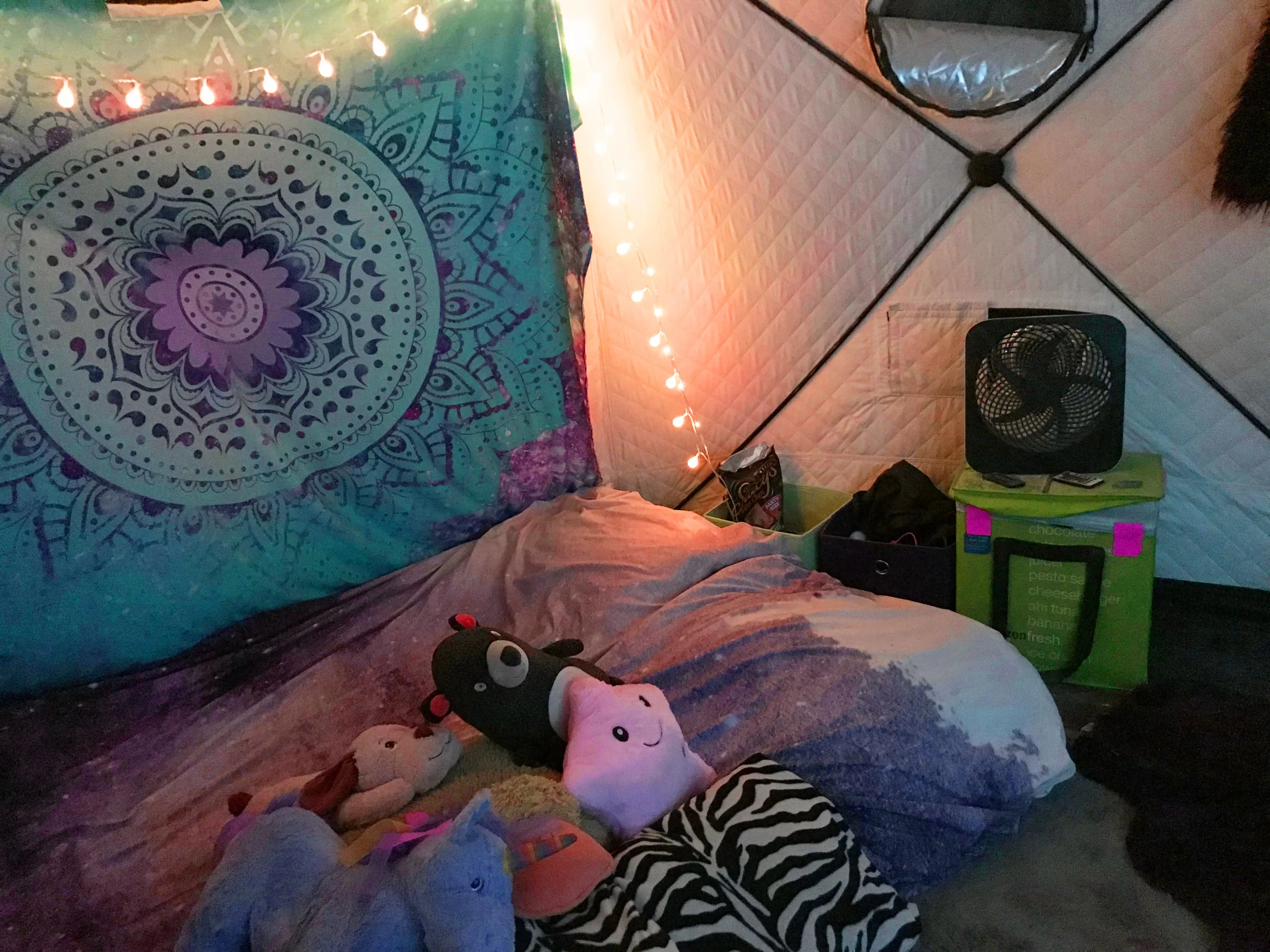 Pro tip #2: A lot of times when you hang a tapestry in a tent or Shiftpod, it will hang forward in the middle and unnecessarily cut off a lot of space. To avoid this ,you first safety pin all four corners to the frame. Next, you put a carabiner through the frame behind your tapestry. Then you safety pin the tapestry in the middle to the carabiner. When you do this from the back of the tapestry, you can't see any of the hardware and it keeps the tapestries snuggly against the wall.